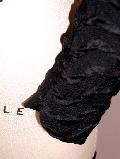 The sleeves are two-piece and the undersleeve has been pieced at about elbow level. The sleeves are set into the armhole naturally in the front, but are set rather far into the body at the back. The fullness of the sleeve cap has been pleated into the armscye. The sleeve is close fitted to the arm and has a 3/4" slit at the wrist. The hem of the sleeve has been faced with black satin.