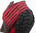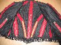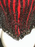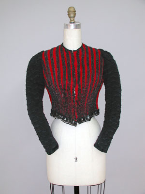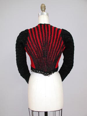 Overview: The red wool bodice is covered with vertical rows of jet beaded trim to create a striped pattern. The heavy silk crepe sleeves have been given a matelasse treatment, creating a raised wavy shiny stripe with a nubby ground.
