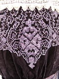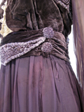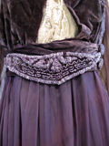 This beaded silk velvet and chiffon dress is lined with black taffeta. It has a cream lace inner bodice which closes with snaps.