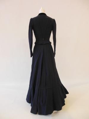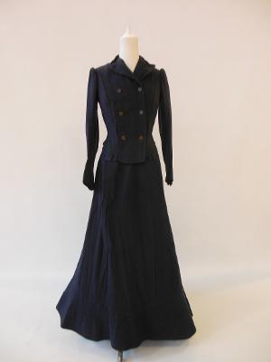 Construction: This wool ensemble consists of a deep blue double breasted jacket and a long matching skirt. The jacket is double breasted, with three tortoise-shell buttons on each side. Next to each line of buttons is a pleated section of fabric one inch wide that ends in a flap on the bottom edge. The sleeves are gathered on the shoulders and have two tortoise-shell buttons on the cuff. The lapel of the jacket is wing-shaped and both sides have a button hole. Black cotton velvet is sewn onto the surface of the collar, by hand. The interior is lined with blue silk taffeta that's fractured, and between the silk and wool is a brown canvas, serving as support, around the shoulders, chest, and armholes.