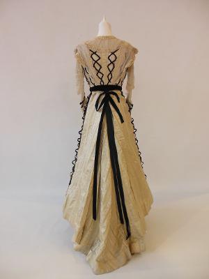 Construction: The bodice has a fitted inner bodice made of cream taffeta. There are 11 baleen bones in cream grosgrain casings. The two bones on each side of center front are very narrow, about 1/8" wide. The inner bodice closes at center front with 9 alternating hooks and eyes. There is an inner grosgrain ribbon waistband, which has two hooks pointing down on either side of center back. The inner bodice is hemmed with a facing of pale yellow taffeta. There is an outer bodice of cream China silk, with vertical 1/4" spaced tucks, laid over cream taffeta. Over top of the China silk are panes of pale yellow and cream silk brocade. The panes are connected with a lattice of black silk velvet ribbons (1/4" wide), which are decorated at each vertex with a black sequin and a clear seed bead. The yoke portion of the bodice is cream chiffon lined with cream China silk. There may have been some type of collar worn inside the neckline. The chiffon yoke is bordered by ruched ribbons with satin edges. There are pleated cream chiffon flanges running from the side front waist, over the shoulder, and down to the side back waist. The outer bodice closes with a few hooks and eyes, and one row of black velvet lattice has a tiny hook on each point which closes onto a thread eye on a proper left side front brocade pane. The bottom ruched trim along the yoke also closes on the proper left side with a hook and bar hidden underneath the chiffon flange. The sleeves are made of one layer of cream China silk, with horizontal 1/4" spaced tucks. The sleeve hems are decorated with the ruched trim and black velvet ribbons (3/8" wide). The bodice waist has a 1" wide black velvet ribbon belt with two bows on each side of the center front waist. There is a long length of the same ribbon attached to the center back waist, but the bow has come undone. Construction The skirt has a cream China silk layer that has vertical tucks ranging from 1/4" to 1/2" wide. The tucks are released about 8" from the hem. The hem of the China silk layer has two rows of self-fabric shirred ruffles, one right at the hem and one 2" above that. The overskirt is made of wide panes of the pale yellow brocade connected with 3/8" wide black velvet ribbon lattice. These ribbons have the same sequin and bead decoration as the bodice. There is a center front brocade panel, 2 side front panels, and 2 back panels. The back panels are deeply pleated at center back. There is a placket at center back with three hooks and thread bars. The waistband closes with three hooks and eyes. The back panels of the brocade form a train, so those panels have taffeta hem facings. The front brocade panels are not as long as the China silk layer, so those panels have the hems just turned up and stitched. The center front measures about 37" long, whereas the back measures about 44" long.