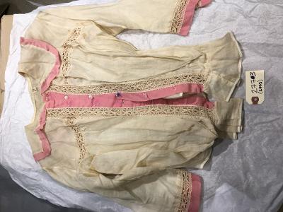 Construction: The blouse closes at center front with a pink placket which has six buttonholes and a hook and bar at the neck. There is lace insertion across the front and back yoke lines, on either side of the center front placket, and at the sleeve hem. The sailor-style collar is edged in pink fabric trim that matches the placket. This pink is also used at the sleeve hem below the lace insertion. The collar is unlined. The sleeves are one piece, lightly gathered into the armscye, and 3/4 length. The blouse body is lightly gathered on the fronts below the yoke and along the center back below the yoke. The front is notably longer than the back for blouson, and it is pleated at the front waist (with two rows of machine stitching to stay the pleats).