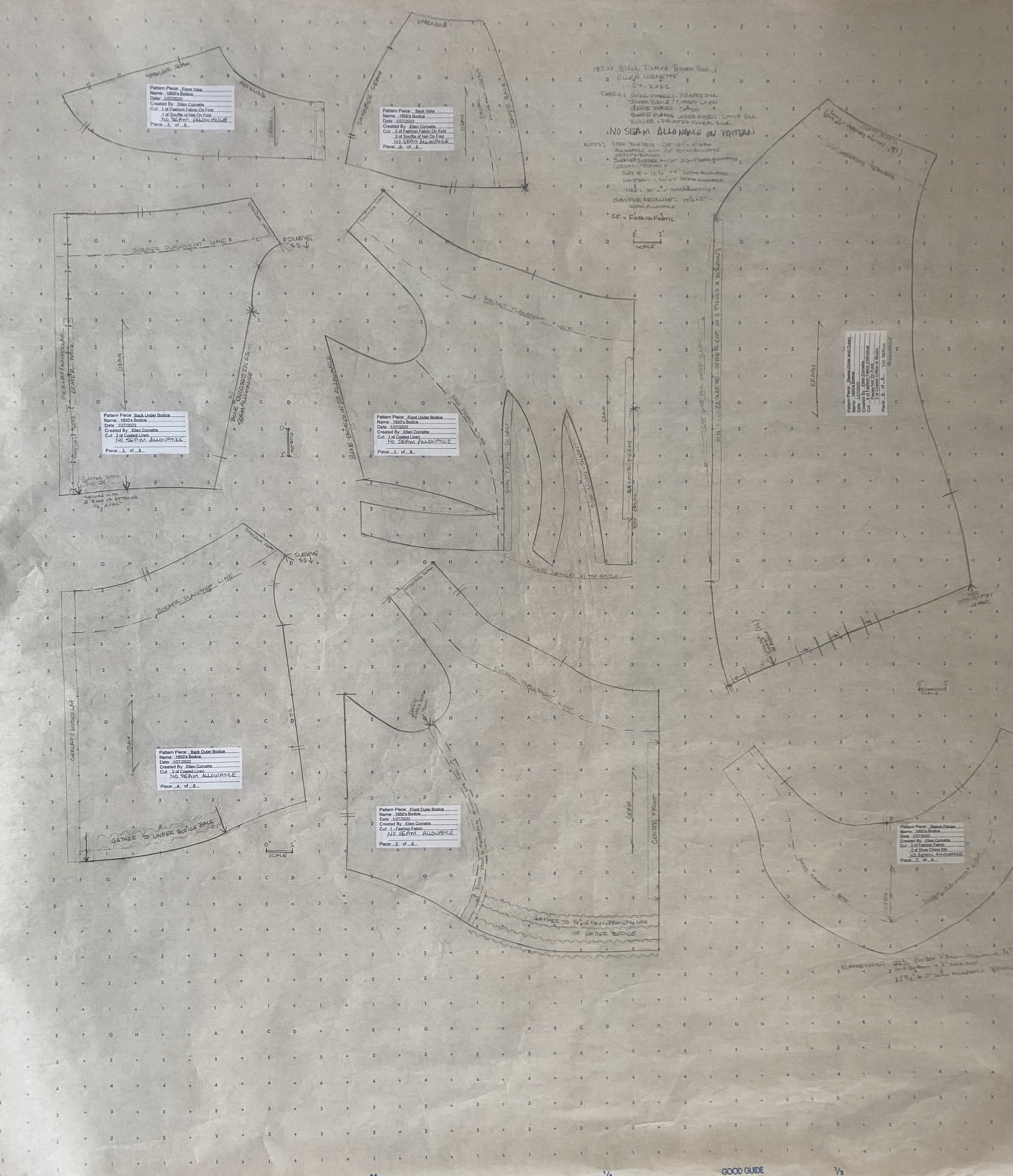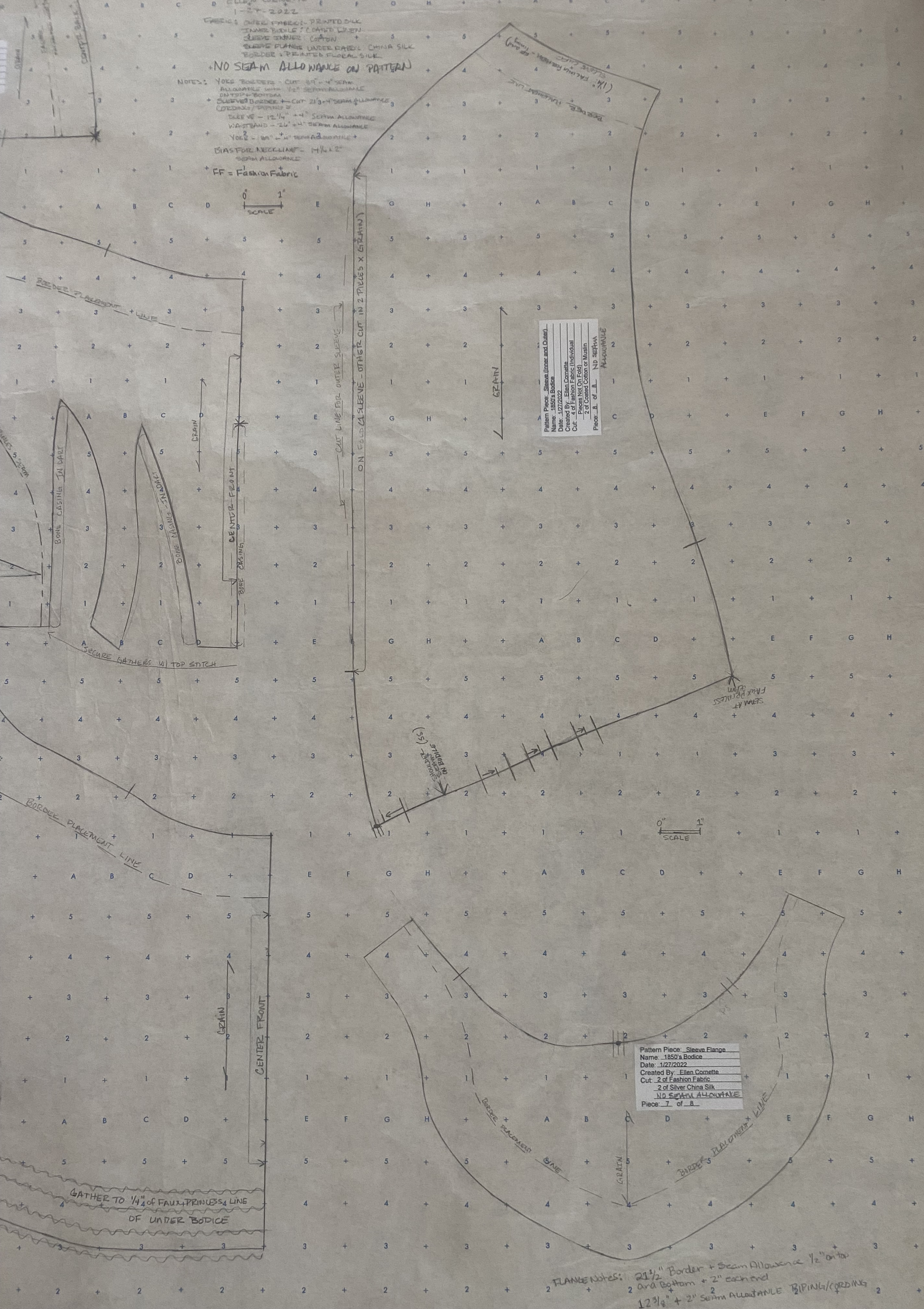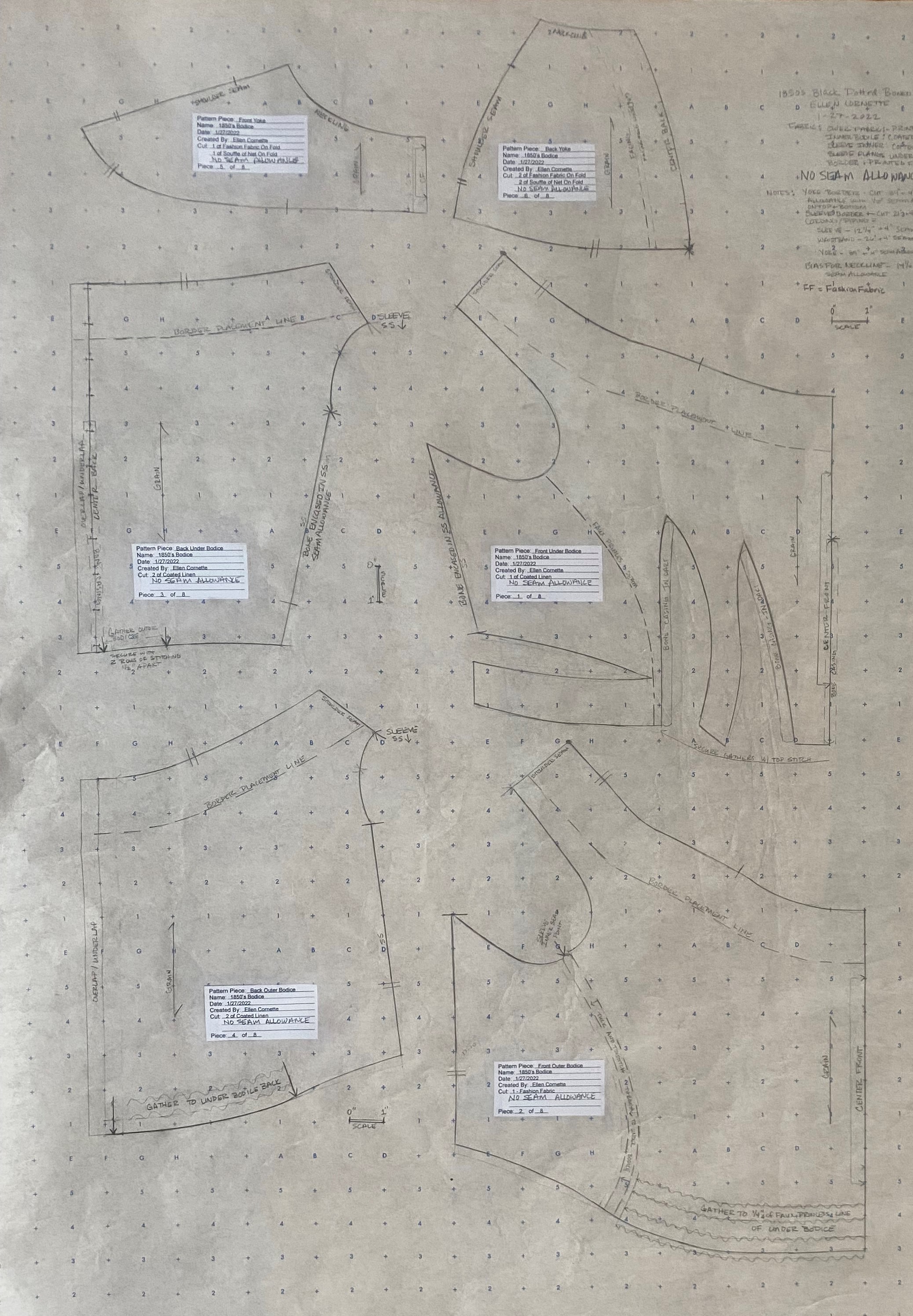The pattern is printed on standard dotted pattern paper, with a 1" square scale. See the detailed description and construction techniques for measurements of the original garment.