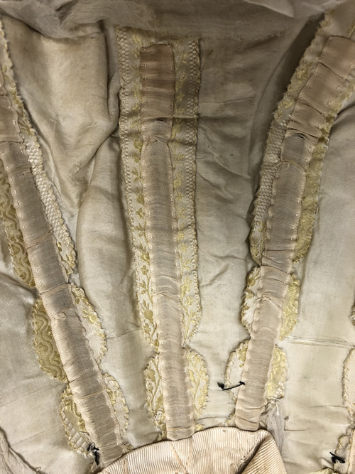 The shoulder flanges are made of silk gauze and measure 3 1/4" wide at the top of the shoulder with a 1 1/2" extension of silk habotai. The extension is half-oval shaped and centered over the top of the shoulder. There is a French seam on the top of the flange that has been machine stitched with a chain stitch (Figure 15). At the center front, the flange is pleated down into a width of 2" organically by the dress maker, so each side is pleated slightly differently. The right side of the bodice has four and the left has three stacked pleats (Figure 11). The shoulders each have two pleats falling away from the neckline. The first pleat measures 1 1/2" and the second pleat measures 1 1/2". Each overlap by about 1/2". At the back of the bodice, the flange is both gathered and pleated into the waist. The excess length from each flange (about 7.5” total) is folded inside the bodice and tacked up by hand. There is a single row of gathered silk ribbon on the full length of the flange closest to the neckline. On the side of the flange closest to the shoulder, there is a single row of ribbon stitched the full length of the flange, and an additional three rows of ribbon stitched over the half-oval shaped extension.