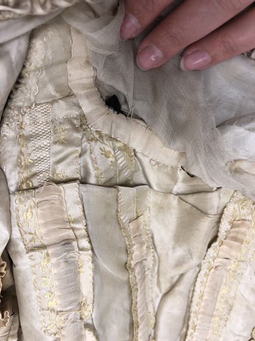 The bodice base closes at center front with alternating hook and eye closures. The second layer of the bodice closes right over left with hook and eye closures at the center front. The final layer conceals the joins of the first two by overlapping the center front, right over left. There are small hooks stitched to the points of the latticed ribbon which attach to crochet thread loops on the side front pane. The neckline ribbon that is stitched to the gauze strip also overlaps right over left and closes with a hook and bar. The yoke line closes along the placket right over left with a hook and bar.