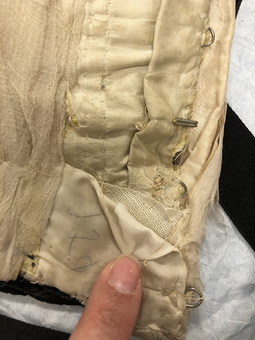 The two side front panels (numbered 2 and 3 in Figure 2 above) are constructed of a single layer of taffeta overlapped and hand stitched with a running stitch on the seam line. Panel 2 is constructed of a heavier weight taffeta that is the same material as the middle layer of the bodice. Panel 3 is constructed of a single layer of the original taffeta. There is a bit of the fashion fabric tucked into a seam between these two pieces (see Figure 2). I believe this could indicate another alteration, or perhaps the fabric had deteriorated in these areas from the presence of sweat and it has been clipped out.