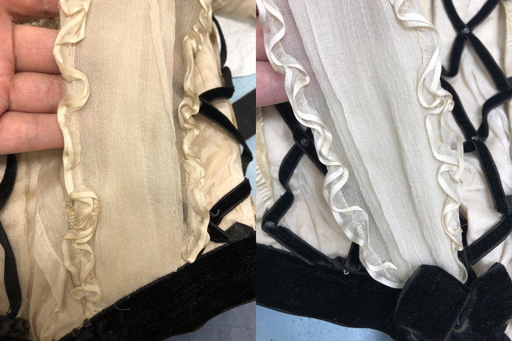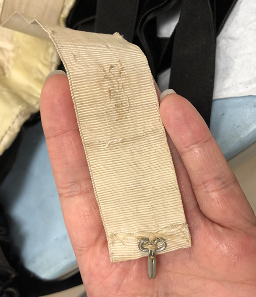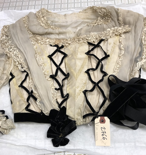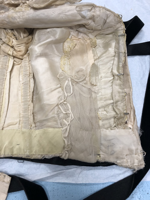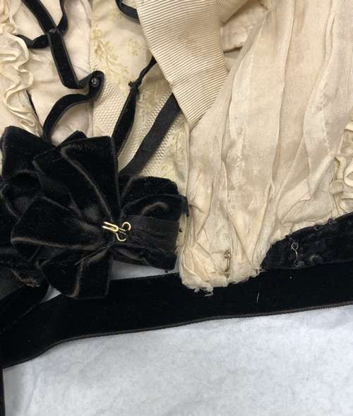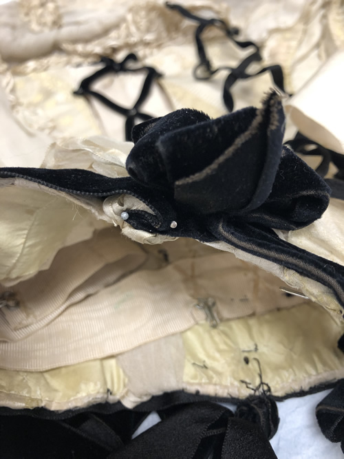 The back waist is trimmed with two rows of black velvet ribbon measuring 7/8" wide. These ribbons overlap at the side seam and the bottom ribbon is clipped away so the front waist is trimmed with only one ribbon. The ribbon is continuous and tied into two five-loop cockade style bows that rest at the bottom of the princess line either side of center front. On the right side, there is an excess of ribbon which was folded and pinned back, but never stitched. There are still straight pins present (Figure 14 above). The ribbon at the center front is mitered into a soft point by hand, and the rosette on the overlapping side has a hook that closes the waistline of the bodice with a corresponding bar (Figure 13). The ribbon extends beyond the hem of the garment along the side front to slightly change the shape of the waistline. There is a bow tacked at center back tied out of the same ribbon. The loops measure 8 3/4" and the tails are two different lengths, the shortest being 32.5" and the longest being 38.5".