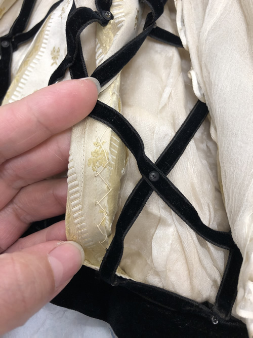 The outermost layer of the bodice is made up of 10 panes of the floral silk brocade. The center front pane is made of two panels cut on the bias and stitched together so that the stripe on the brocade forms a chevron pointing to the waist (see Figure 9 above). Each pane is finished by turning back the raw edges and stitching with a cross stitch. There is some scarring present on the third piece from the center that indicates it was once stitched through by machine (see Figure 10 above). This is further evidence that the garment has been re-made. These panes are spaced apart across the bodice and connected by a lattice of black velvet ribbon that measures 1/4" wide. The ribbon is mitered into a point at each connection to the panes. It is decorated with a matte black sequin and a clear glass seed bead stitched at each intersection of the lattice and at each point.