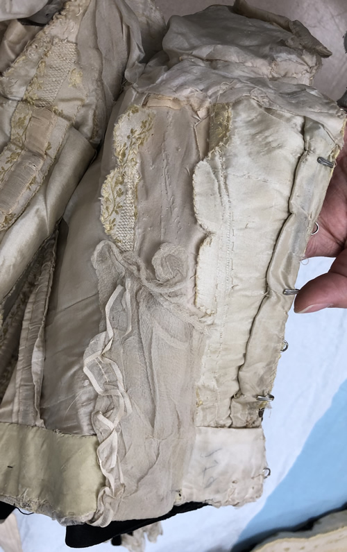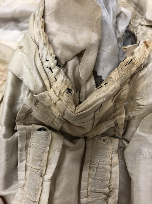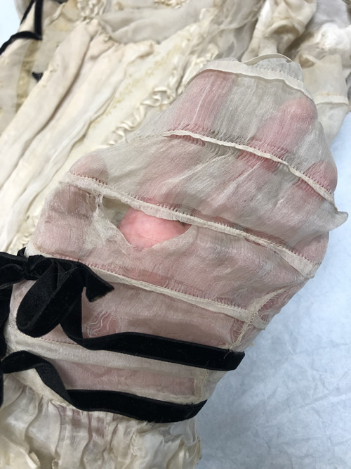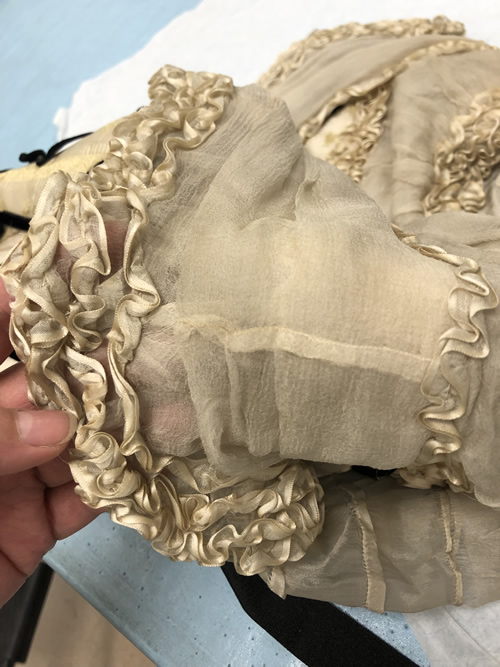 The sleeves are badly damaged and difficult to handle. They are constructed from a thin silk habotai that has deteriorated badly over the years (Figure 15). As much as I can discern from the placement of the tucks on the grain line, they are tube-like in construction with a slight bit of shaping happening along a seam running from the front muscle point to the hem. This seam is done as a French seam and has been lock stitched by machine. There are two ribbons at the hem above the ruffle spaced 3/4" apart. They tie on the outside arm in a neat bow and are loosely tacked in several places along the sleeve (Figure 16). There are eleven 1/4" tucks down the length of the sleeve. The sleeve length falls just below the waistline which indicates 3/4 length sleeves. There is a gathered ruffle at the hem of the sleeve that measures 1.5” wide and has gathered ribbon trim along the hem to match the yoke line and shoulder drapes. The cap appears to be fitted and not have much fullness. The sleeve is set in by hand and the seam allowance is overcast by hand (Figure 16 below).