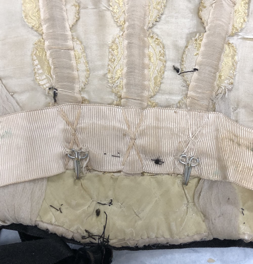 The center front panel is constructed in the same way as the back panels – the fashion fabric is flatlined to a lightweight taffeta. On the front of the panel we can see a series of 12 hand bound eyelets (see Figures 4 and 5 below), indicating that it laced together at the center front when it was originally constructed. I believe the panel originally had two layers of taffeta flatlined to the fashion fabric. Later, an alternating hook and eye closure was added to this piece and the layer of taffeta that rests closest to the body was peeled up and used to conceal the underside of the hook and eyes. This created a tuck that is bound by hand around the front seam. The alternating hook and eye closure helps support the theory that a professional dressmaker worked on the reconstruction of this gown. A thin piece of baleen is set into a channel that was machine stitched with a chain stitch. This baleen measures approximately 6" on each side, but I believe it originally ran the length of the entire channel, which is 11 3/8" and it was shortened on a later iteration of the bodice. The front base layer is also longer than the outer layers and there is a tuck measuring 1" (total) on the center front.