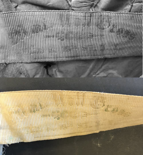 On the inside of the bodice there is a silk moiré grosgrain waist tape. The tape is attached only at the center back and side back seams with three large X shaped stitches (Figure 17 below). There are two hooks stitched at the bottom of the waist tape. I believe these attached to the skirt to keep it from falling. The waist tape closes with a single hook. No bar is present. There is some scarring and fading on the waist tape where hooks and eyes had been stitched (Figure 19 below). On the waist tape there is also evidence of a dressmaker’s stamp (Figure 18). The ink is mostly gone - only small bits of greenish pigment remain, however a slight impression can be seen when the tape is held perpendicular to a light source. I’ve tried my best to enhance the image of the label with digital manipulation. It appears to have a brand (or dressmaker’s name) that is not very distinguishable. There is also an address stamped below the name, which appears to read either 136 W. 79th St N.Y. or 136 W. 19th St N.Y.