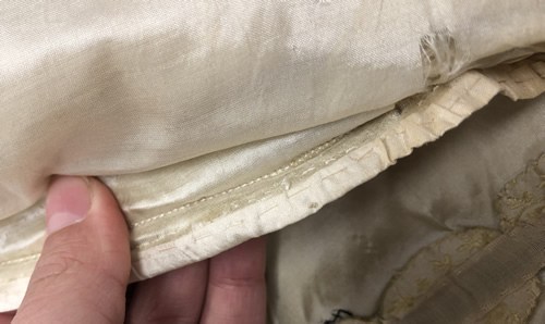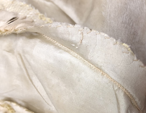 The side front and side back seams on the underarm piece (numbered 4 in Figure 2 above) have been machine stitched with a lock stitch. The underarm panel is constructed of a different material which supports the theory that this garment was either heavily altered or reconstructed at one point in time. This panel is a lightweight cotton or linen flatlined to a heavier, slightly more yellowed silk taffeta. The seams here are bound by hand with a soft, plain-woven silk tape (see Figure 2