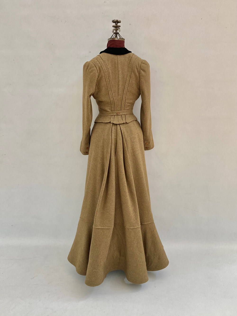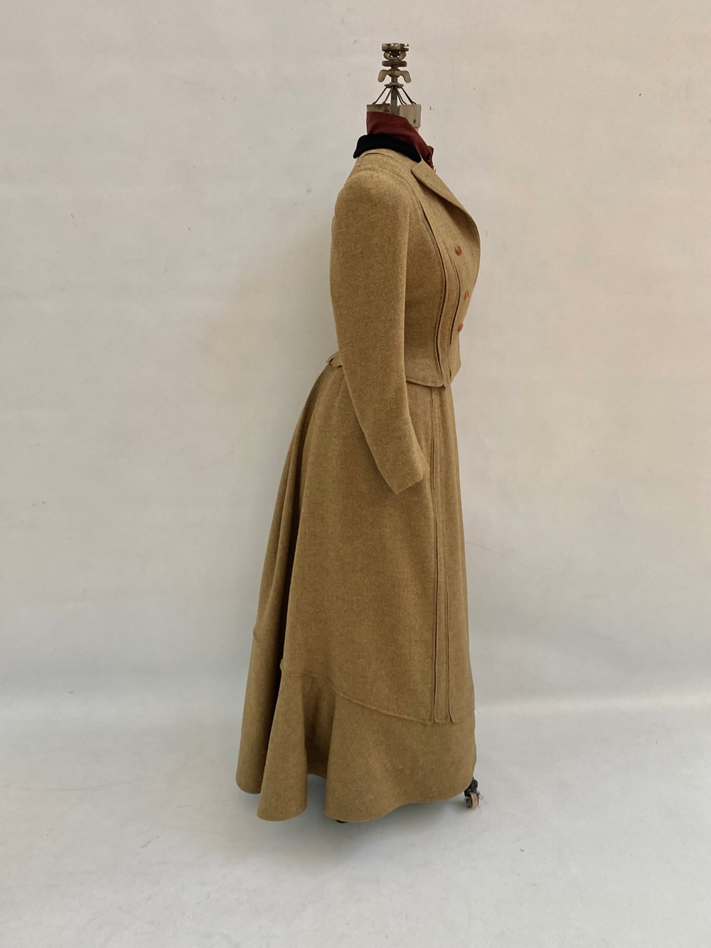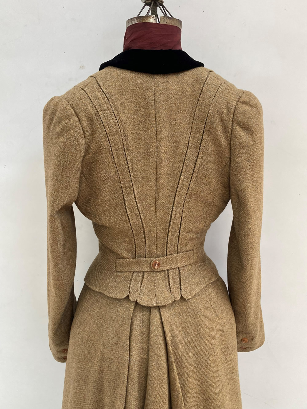 My process began by sourcing the main fashion fabric. In the original, the wool was a dense, medium-weight wool with a distinctive twill weave. I struggled to find navy-blue wool with these qualities, but I found several period fashion plates of similar suits in brown so I expanded my fabric search to include brown wool and bought eight yards of 55-inch-wide brown twill wool. While I could have lined the suit in habotai silk like the original, the entirely shattered state of the original convinced me to use a more durable option: a polyester blend Bemberg. The collar velvet is black as in the original. While this is a much higher contrast combination than the original navy suit and black collar, my period research showed that a black collar on a brown suit was not uncommon. The material I used to structure the suit front is an Italian-made French canvas very similar in weight and weave to the original, although slightly stiffer. I considered this a good option as the canvas in the original has likely softened over time. The buttons are made from horn, like the original, however they have four holes instead of two.