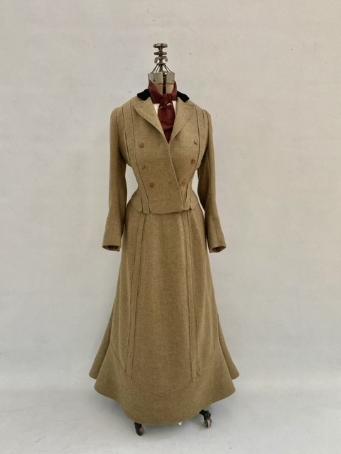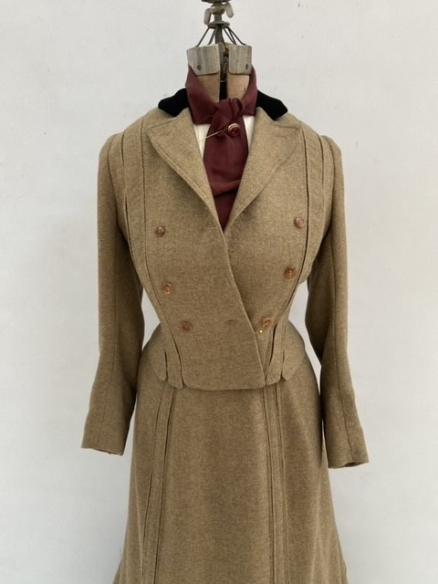 When selecting a garment to reproduce, I was initially drawn to this suit because it demonstrates a complexity of construction and mastery in design that I found interesting. The supremely functional nature of the garment is a product of women's increasing freedom to pursue professional activities and engage in robust sports. I was intrigued by the clever use of slot seams and enthralled by the delightful swish imparted on the skirt by the quilted hem. In a word, I found this walking suit delightful.