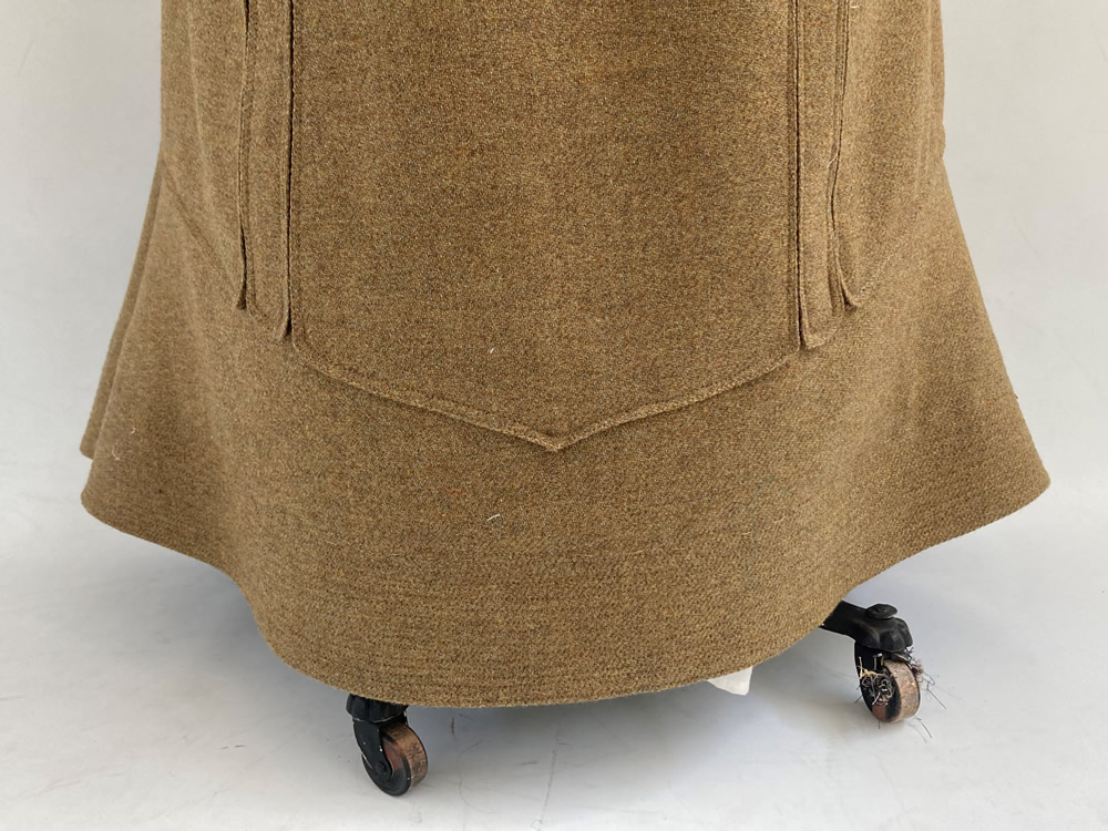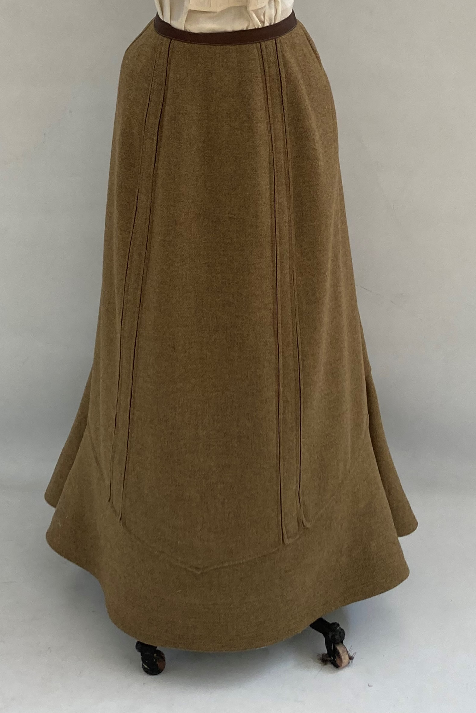 Other than the previously mentioned pattern alterations and change in lining fabric, the reproduction jacket is constructed nearly identically to the original. The reproduction skirt, on the other hand, has several differences. While my reproduction fabric is very similar to the original, it is a little softer and less densely woven. To make up for this, I flat-lined the skirt panels with silk organza dyed brown to match the inside of the skirt. To the hem, I added a bias strip of light hymo the width of the quilted panel. These techniques are often used in a theatrical context to help keep long skirts away from the performer’s feet. Along the same lines, I chose to use bias to bind all the interior skirt seams, unlike the raw seams of the original.