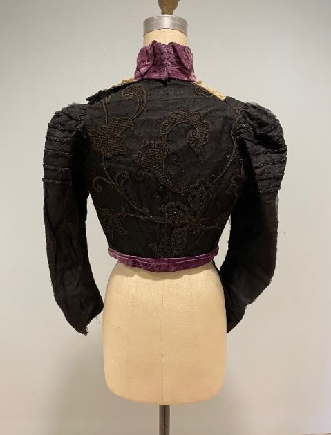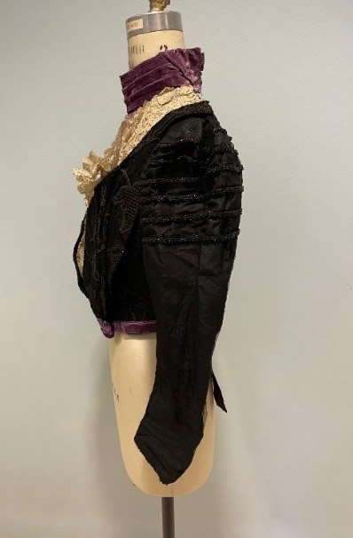 This women’s bodice from ca. 1898-1903 was made in Chicago, Illinois, USA. It features a long-waisted pigeon breast silhouette, fitted back, long fitted sleeves with a slight shoulder puff, and a high stiff collar. It is black with jet beaded mesh on the torso and is ornately decorated with jet beaded trim, purple velvet, purple chiffon, and handmade off-white lace.