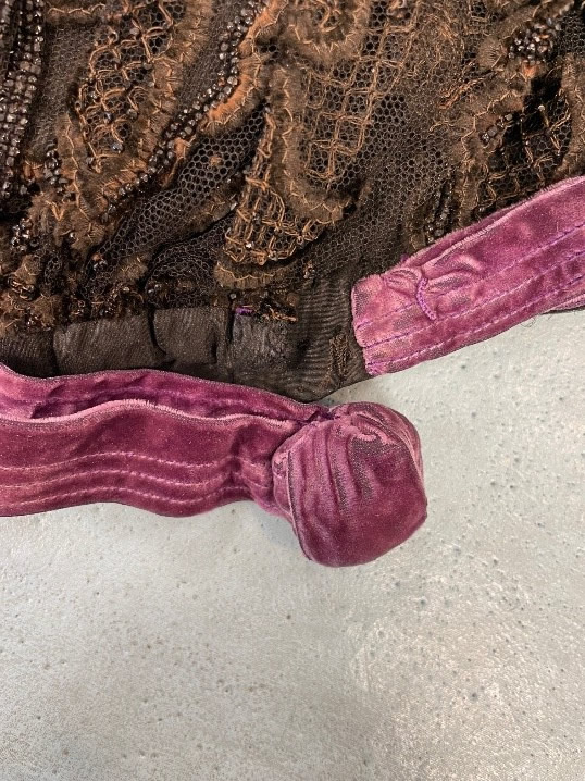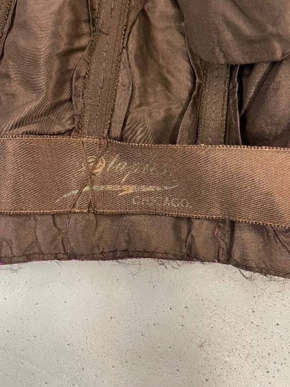 A strip of bias purple velvet is used as a belt at the waist. It is pleated once horizontally, top-stitched, and finished on the plastron overlap with a decorative ball, as seen in Figure 10 below. It does not appear there is anything inside the ball to stuff it, so the fabric may be tightly wound around itself. A hook fastens the belt to the waist.The waist edge and plastron edge are faced with a 1" wide strip of bias taffeta, put on entirely by hand. There is a fancy satin waist tape with the words “Staples Chicago.” printed on it, as can be seen in Figure 11 below. Additionally there are two skirt hooks 2" apart at center back.