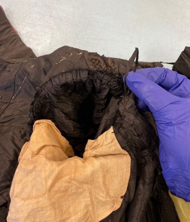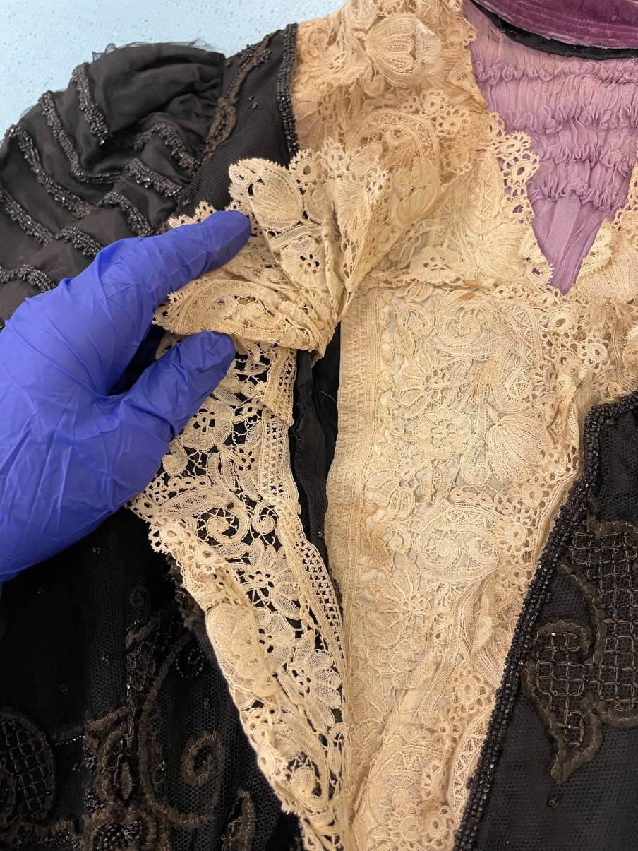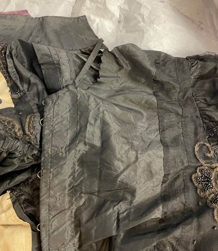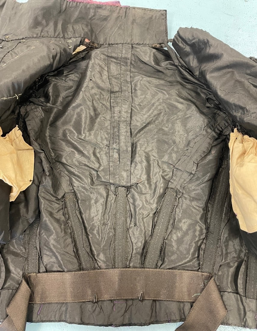 This bodice is extremely fragile, especially the softer fabrics. The base layer of taffeta is structurally unsound. The right neck edge has torn presumably due to the stress of the plastron (see Figure 12 below). The sleeves contain sparse remnants of cotton mesh which disintegrates when handled (see Figure 13 below). It is uncertain whether this is the same beaded mesh as covers the front and back. It is possible that this layer of mesh was originally included and then removed when it became fragile. A scant amount of 1/2" gathered mesh remains on the wrist edges. There are holes in the beaded layer around some of the thread bars. As mentioned above, the powder pigeon front is flattened from storage and some of the tacking between decorative layers has come apart. There do not appear to be many alterations to the bodice, save for the center back seam.