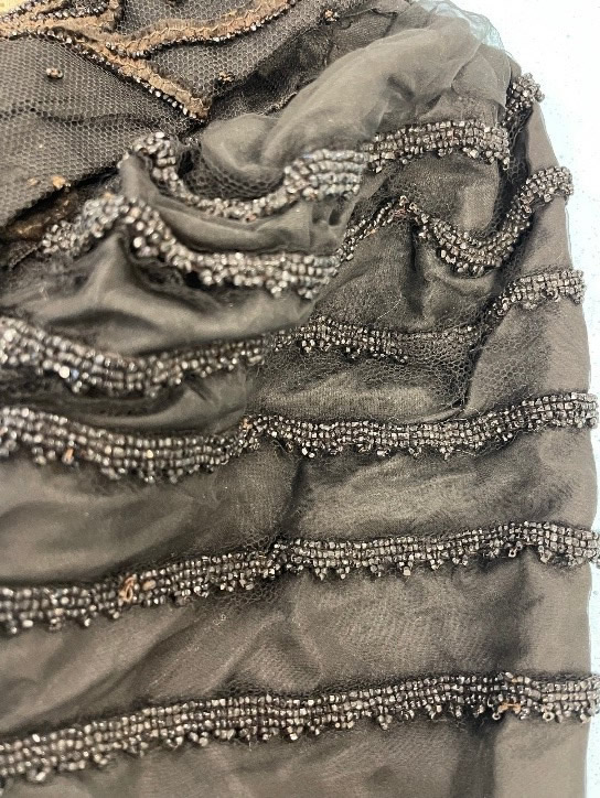 The garment has an over layer of black silk chiffon, then beaded silk (or cotton) net. The pattern of the beading is asymmetrical on front, as can be seen in Figures 1 and 3 above. The beaded net wraps as one piece across the back and under the plastron, and is hand-stitched flat to the bodice foundation through the mid-shoulder to waist. On the side where the plastron is attached, the beaded edge of the plastron is turned under and stitched.