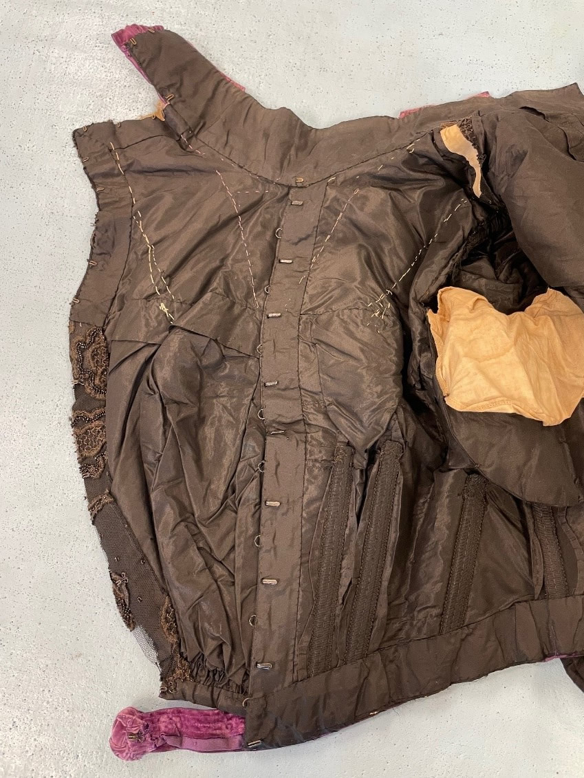 There is a center front closure on the inner bodice, which fits closely to the corseted body. A decorative plastron covers the inner bodice. The plastron closes over the front and creates a highly decorated illusion obscuring the closure and emphasizing the pigeon-breasted shaping. The plastron is attached to the yoke of the interior and side front and fastens to the left side. It fastens to the center back collar, shoulder seam, down the front armscye, and down side front with hooks and thread bars. Then an extension of the velvet belt hooks onto the left side at the waist completing the illusion. The collar is attached to the plastron and closes at center back with hooks and eyes, as can be seen below in Figure 4.