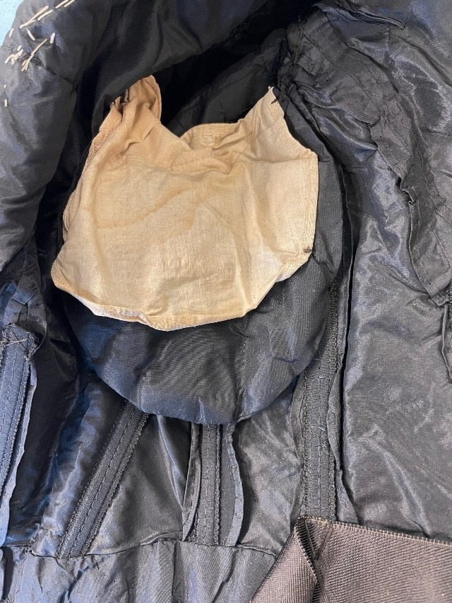 The sleeves were set in by hand with a backstitch, and finished with a whipstitch. There is a separate pad placed in the side front to augment the wearer for a fashionable silhouette (see Figure 7 below). It is a circular taffeta case filled with wool or cotton. Natural colored cotton pit pads cover the shaping pads to protect the garment from sweat, but they show little signs of damage. There are hanging loops stitched into the armsceye, as can be seen in Figure 8 below.
