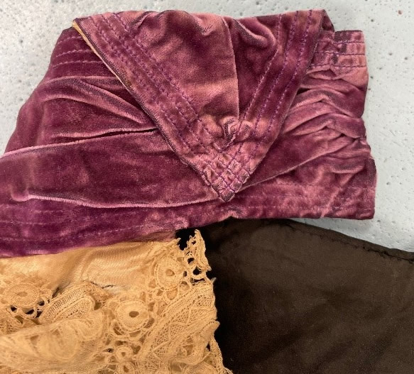 The purple velvet has faded, and something closer to its original color can be seen on the inside of the pleats. The lilac chiffon has also faded in color. The brown flocking on the beaded mesh may also have faded from what would have been black originally.