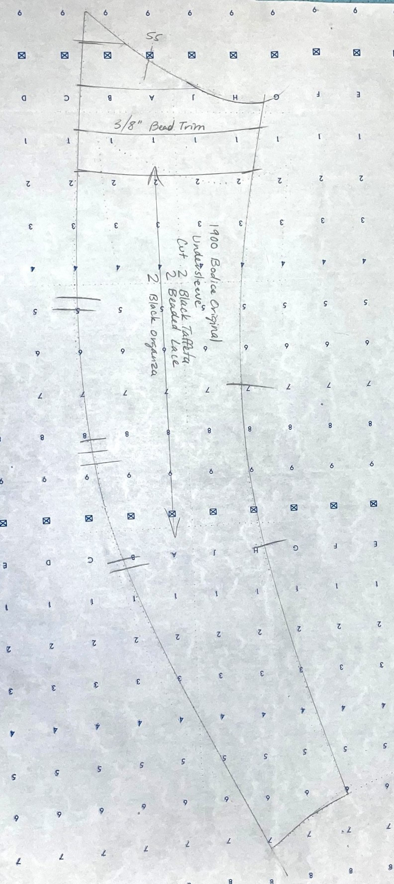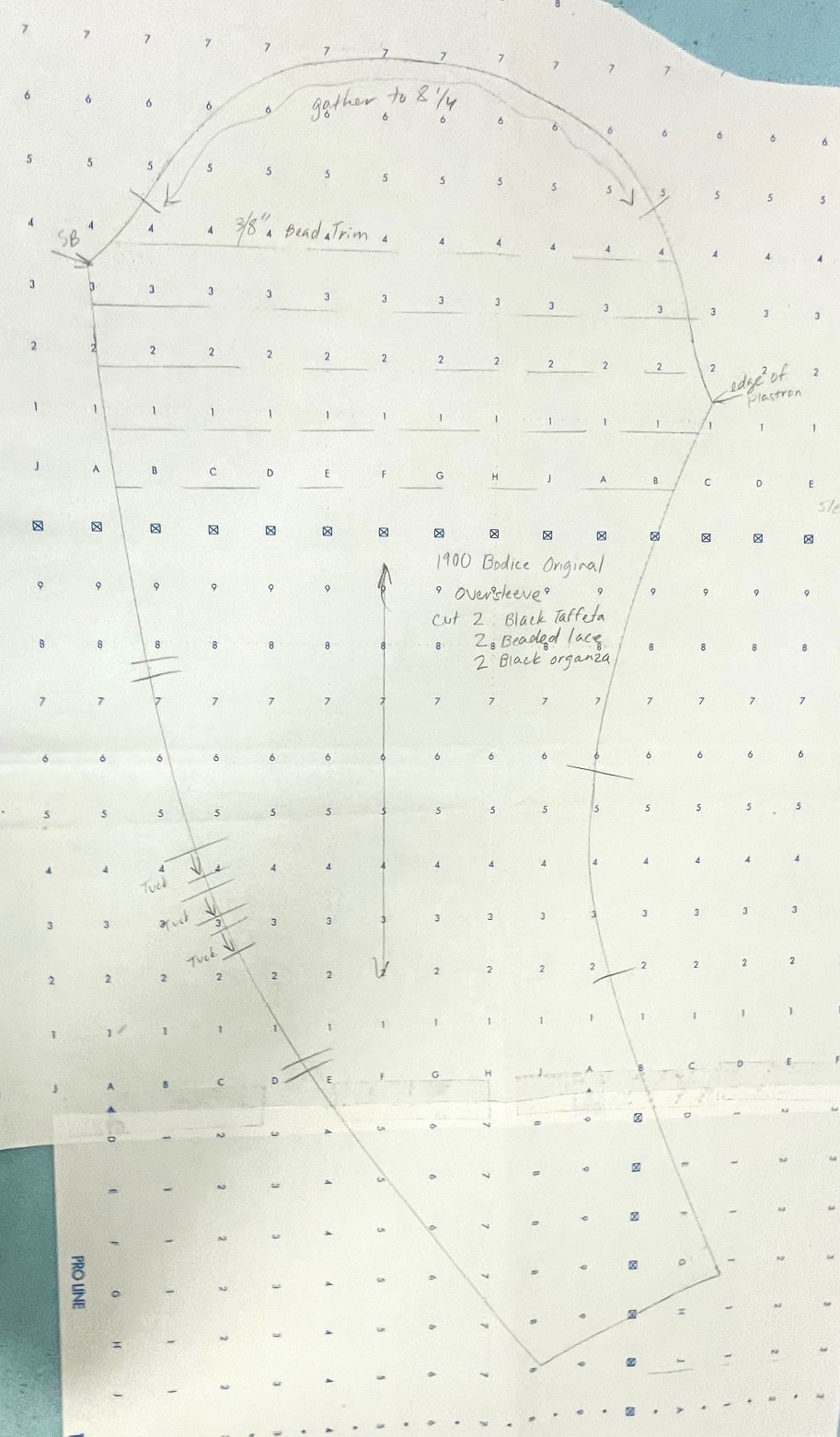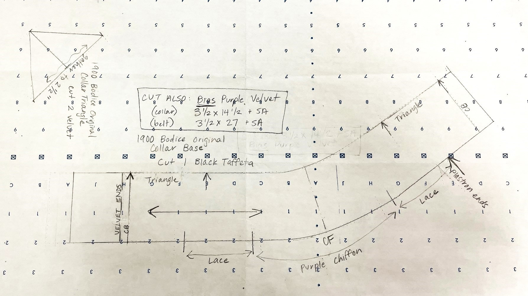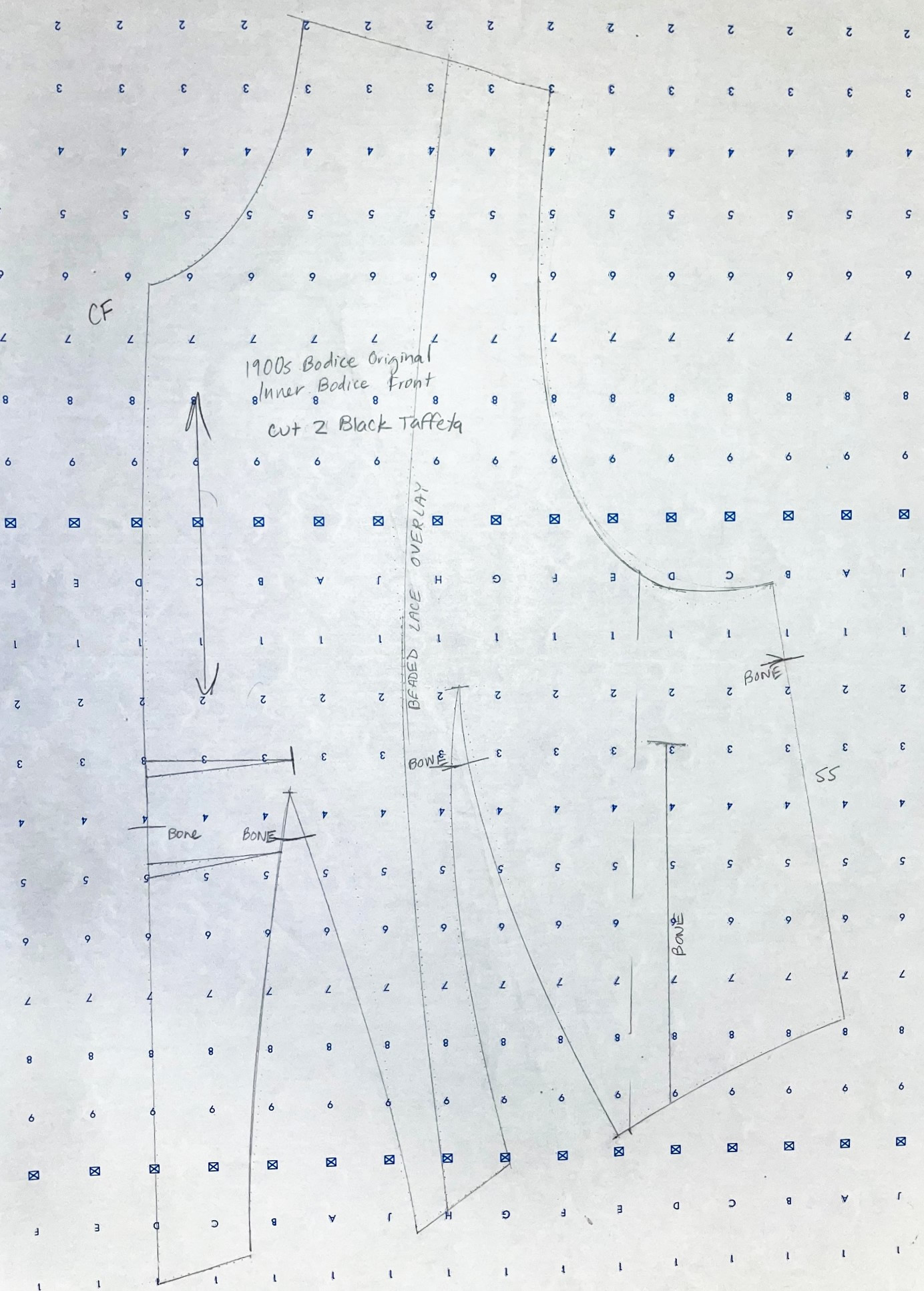 There are thirteen pages of pattern pieces for this bodice, all drawn on standard pattern paper with a 1" wide grid. The pieces, presented in sections, are for the inner bodice, the plastron, back lace overlay, sleeve, and the belt and collar.