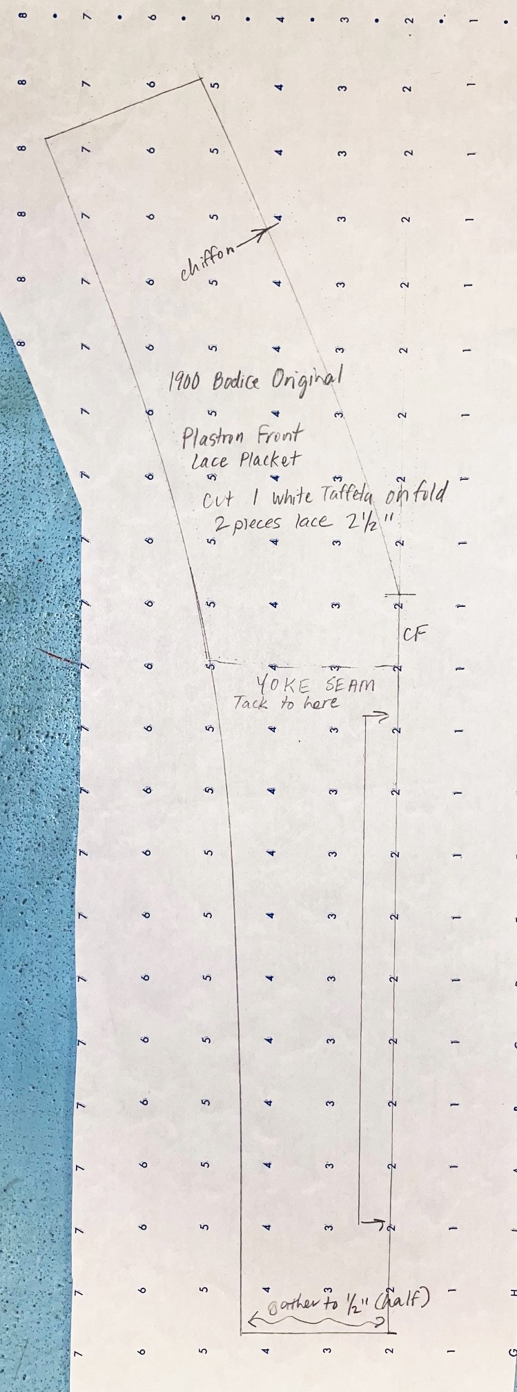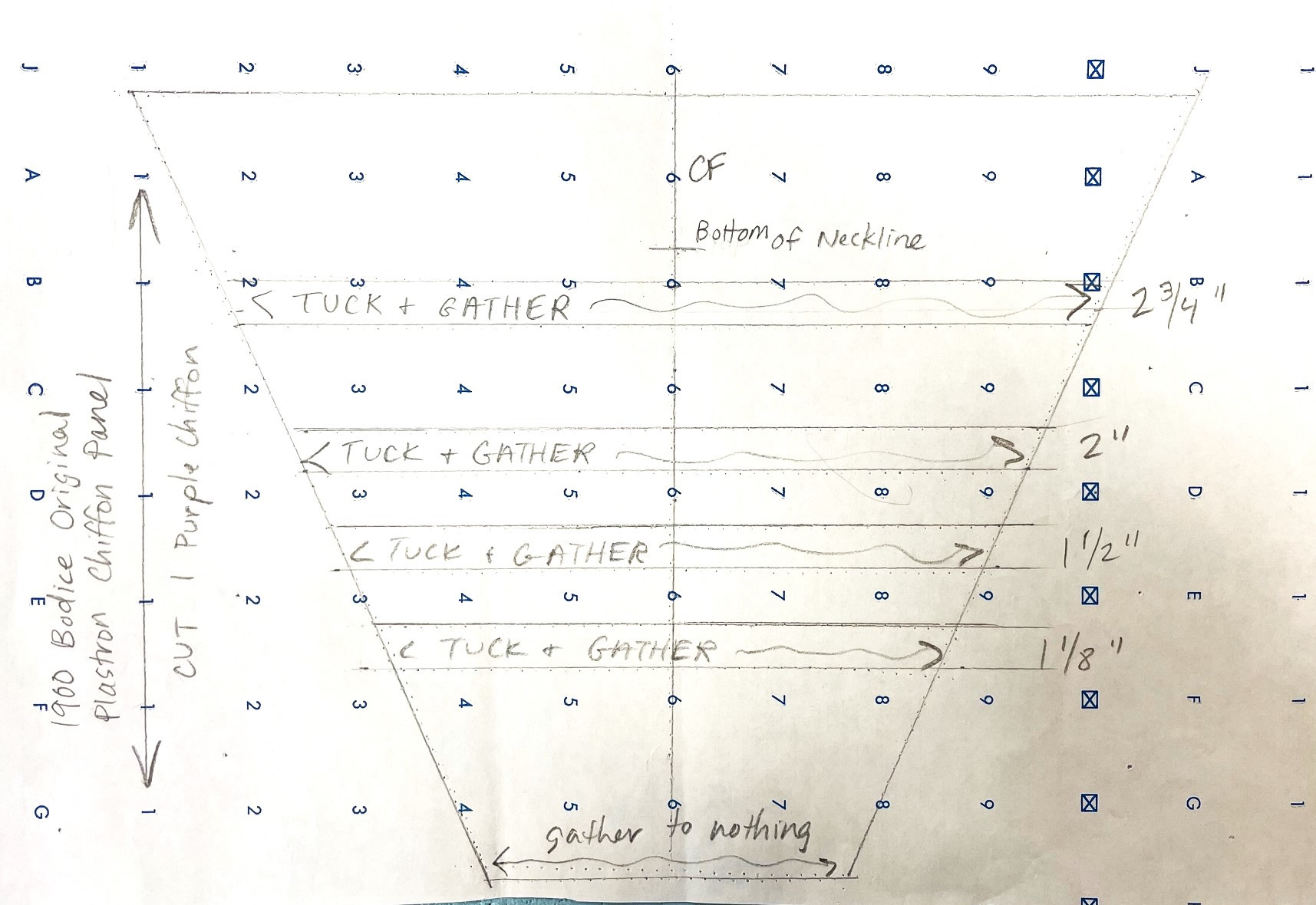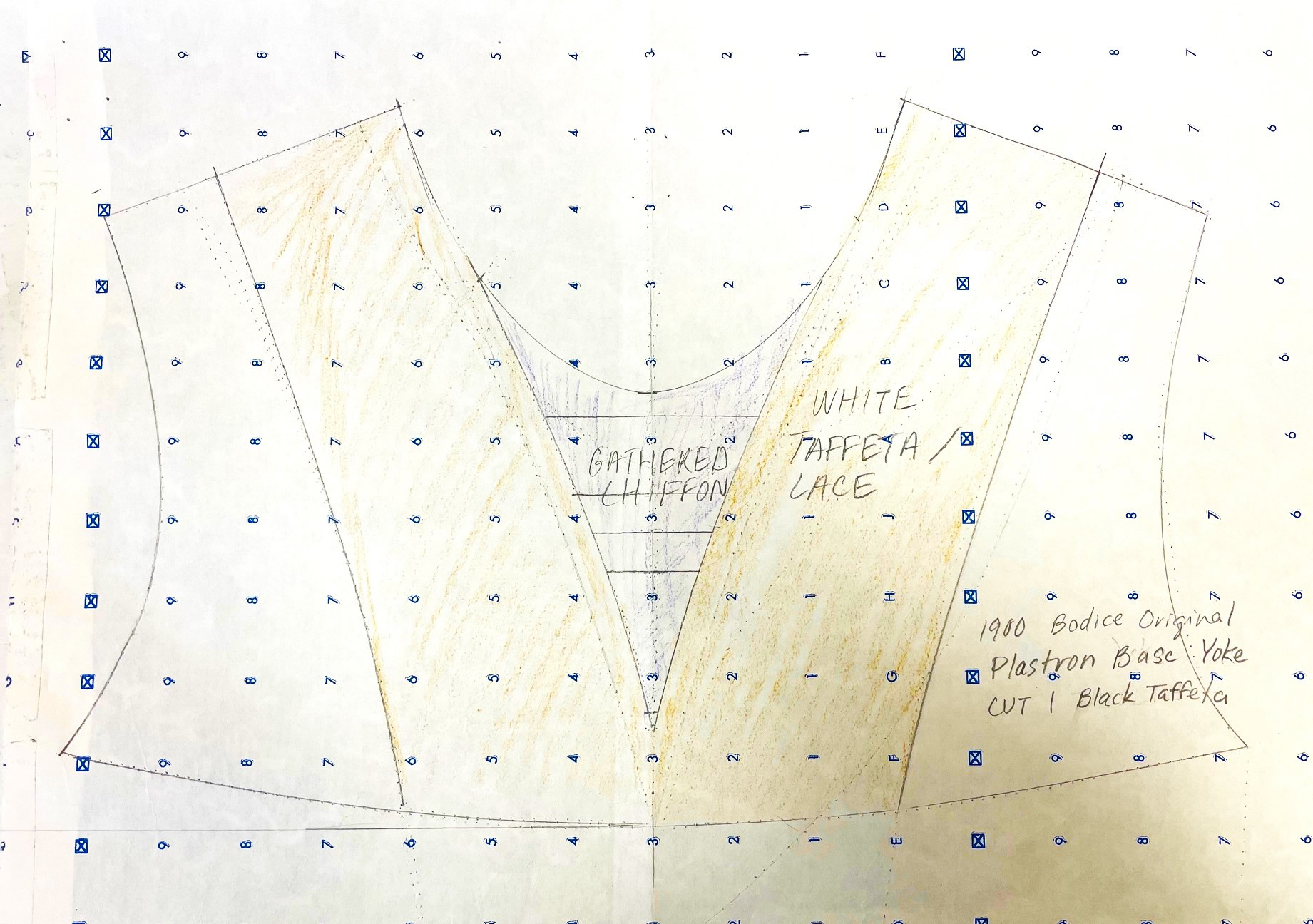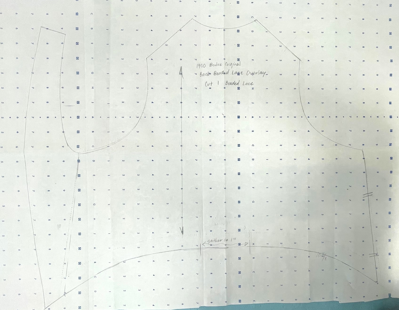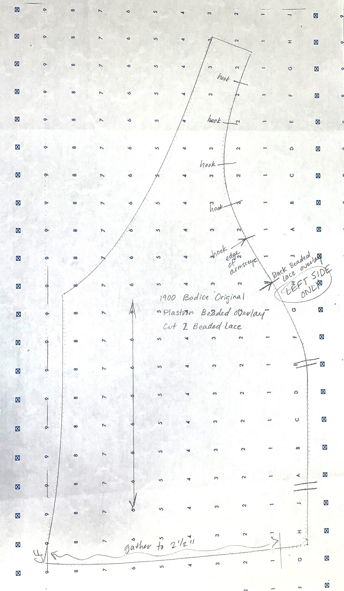 There are thirteen pages of pattern pieces for this bodice, all drawn on standard pattern paper with a 1" wide grid. The pieces, presented in sections, are for the inner bodice, the plastron, back lace overlay, sleeve, and the belt and collar.