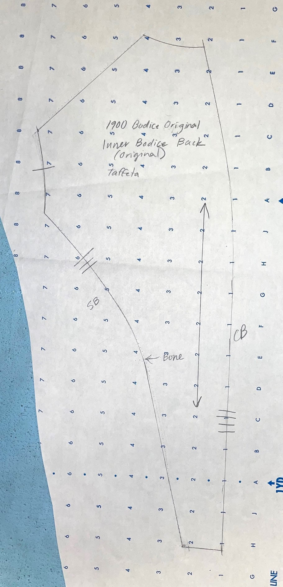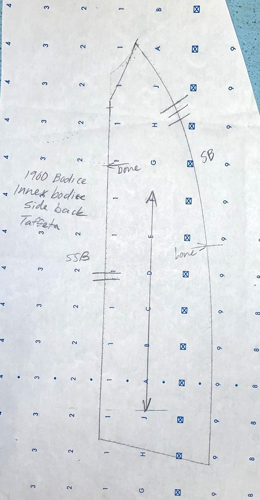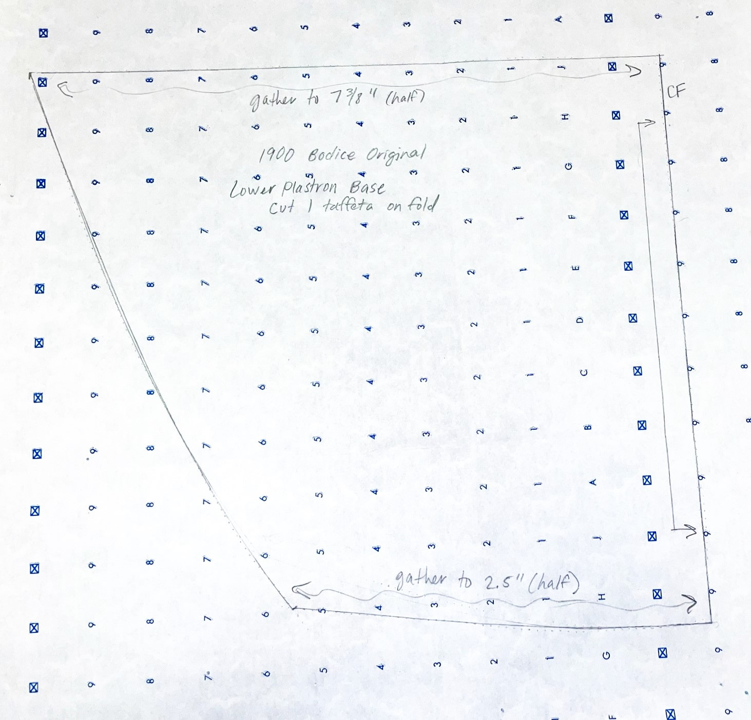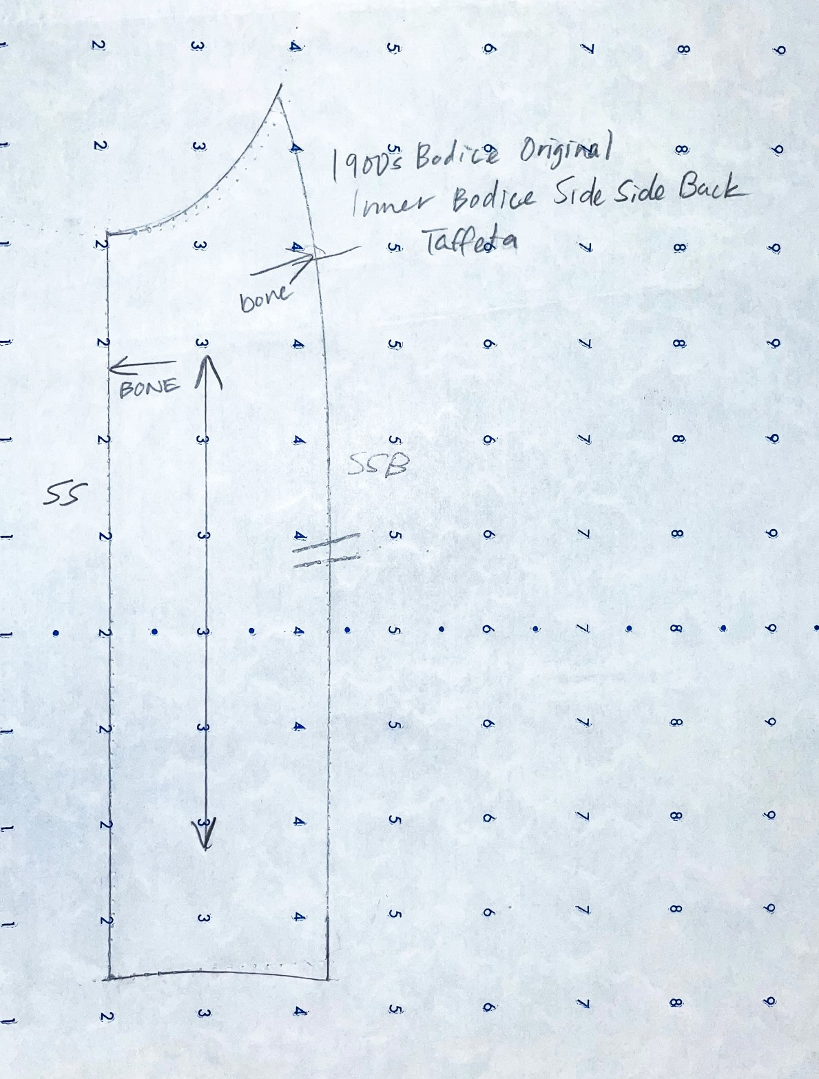There are thirteen pages of pattern pieces for this bodice, all drawn on standard pattern paper with a 1" wide grid. The pieces, presented in sections, are for the inner bodice, the plastron, back lace overlay, sleeve, and the belt and collar.