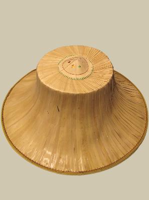Construction: The surface is created from layers of flat palm which are overlapped slightly to shed water. The interior is woven. There is a narrow strip of plastic along the edge to hold it into the circular shape. Inside there is a woven crown known as a rang, attached to the hat, to help hold it on the head and provide ventilation, which is 7" across and 5" deep. The hat itself is 17" across; the top of the crown measures 7.5" across. See supplemental pages for additional information.