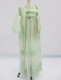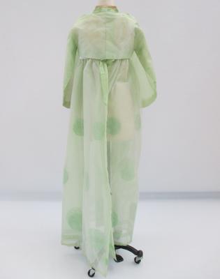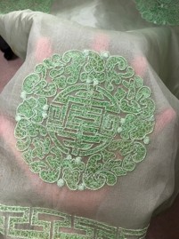It is made from light green silk organza and consists of a jeogori (jacket) and chima (high-waisted skirt with a sleeveless bodice)). There is also a pair of white cotton trousers that go underneath the sheer chima. The emblems embroidered on, or woven into, a hanbok typically represent nature and are often plants or animals but they can also be geometric patterns or elements of scripture, according to the wearer’s wishes. The pattern on this hanbok (See Figure 3 below) is a geometric version of a Korean decorative element that is surrounded by twinning leaves and flowers. It is a slightly darker green than the garment and has small white flowers.