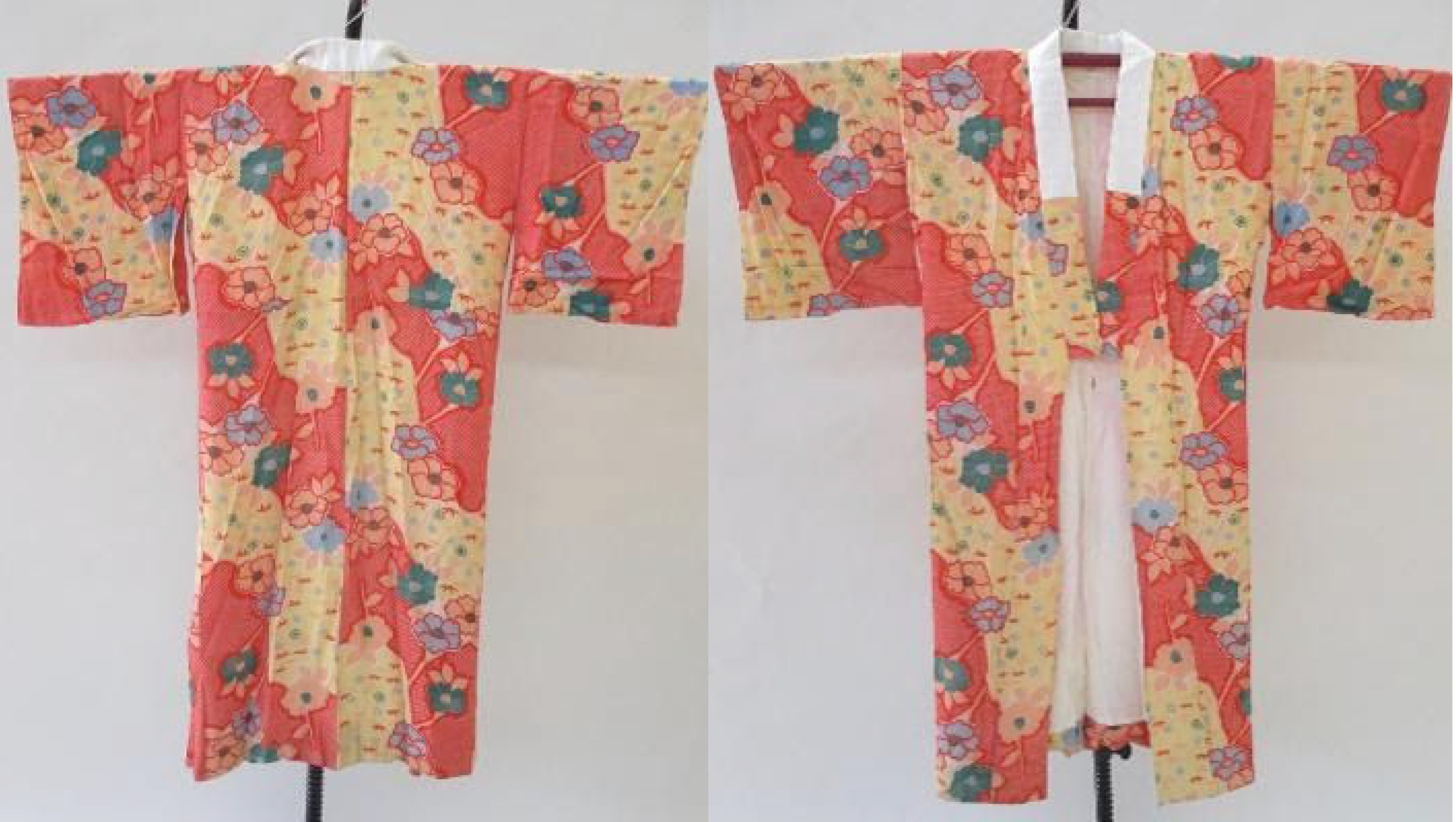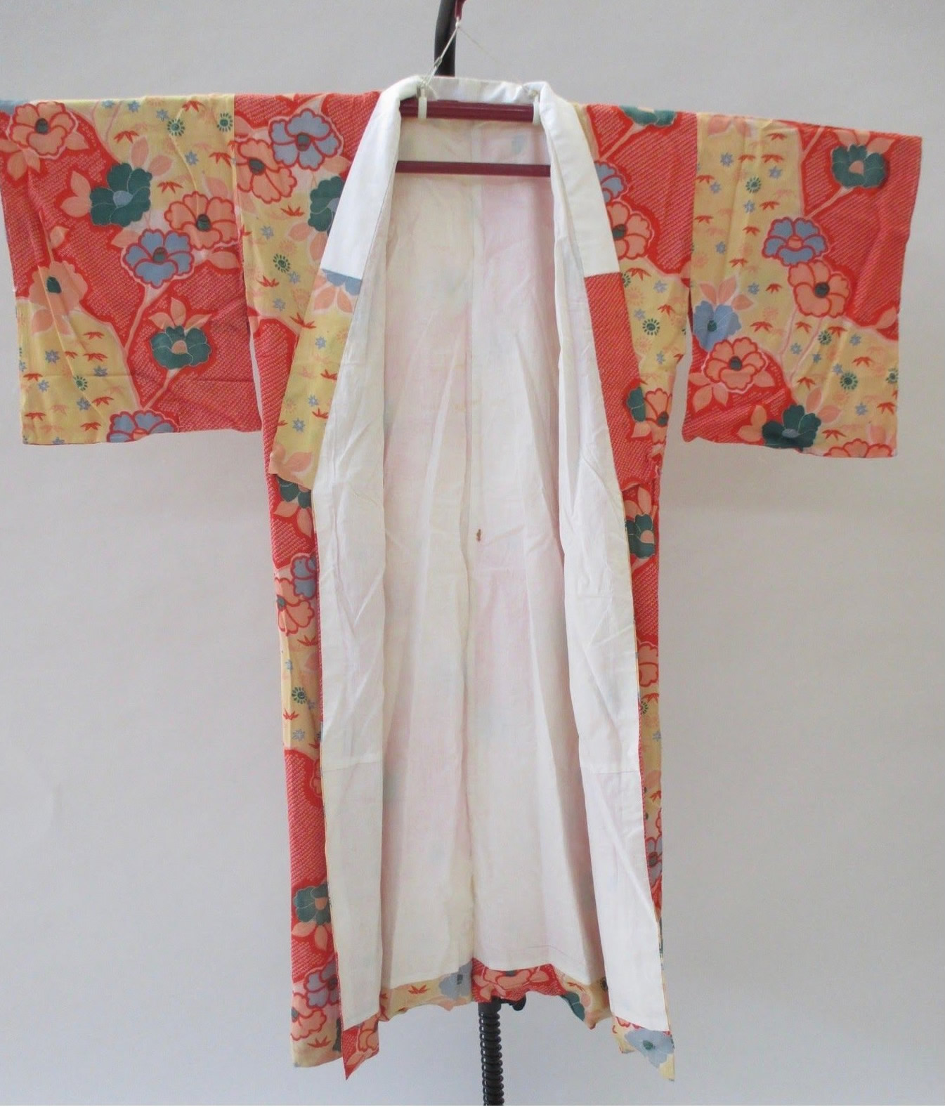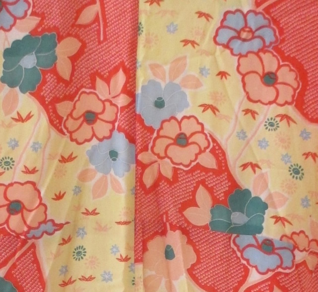 The body of the kosode is lined with cream silk while the sleeves are lined with self-fabric. Center back of the garment is not as carefully aligned as might occur with a hand-dyed garment indicating that this one was more recently manufactured.